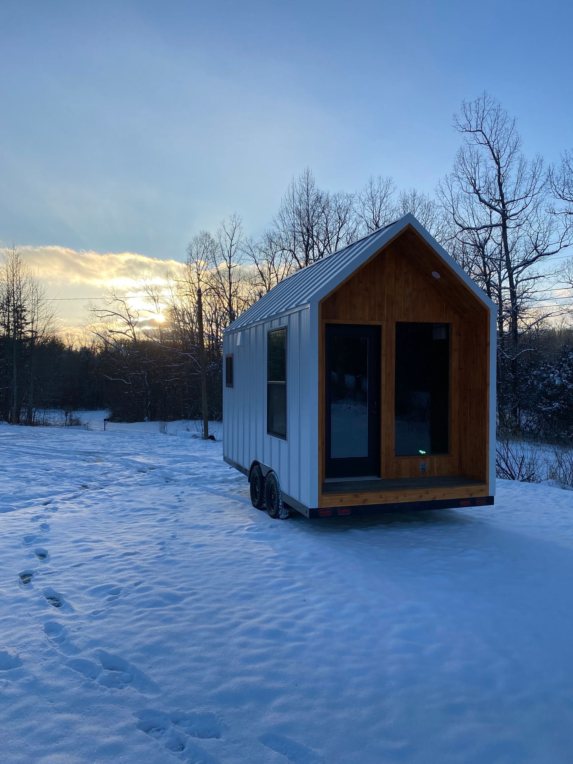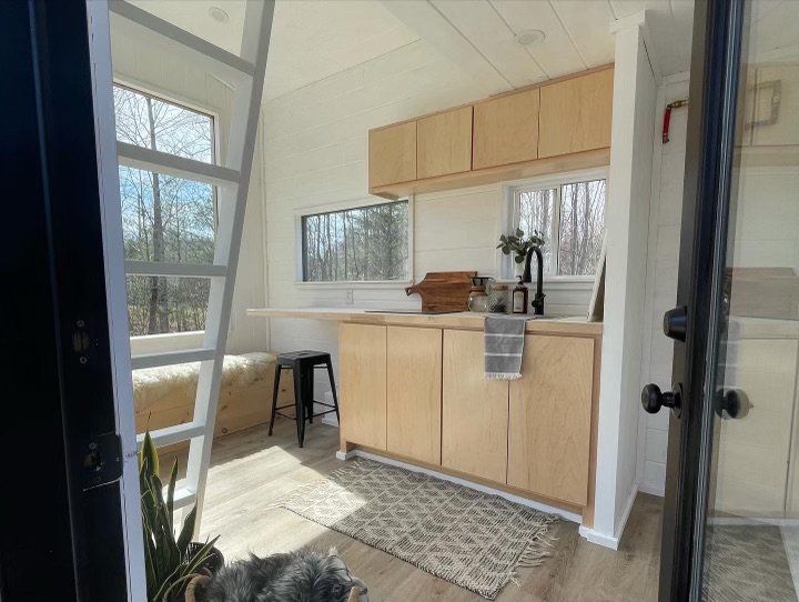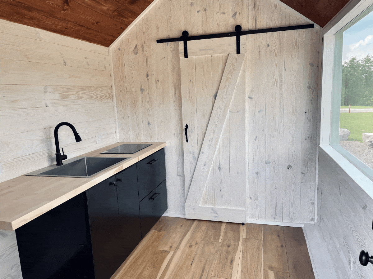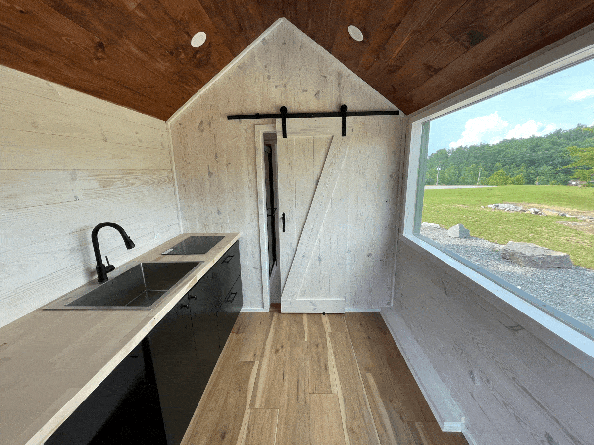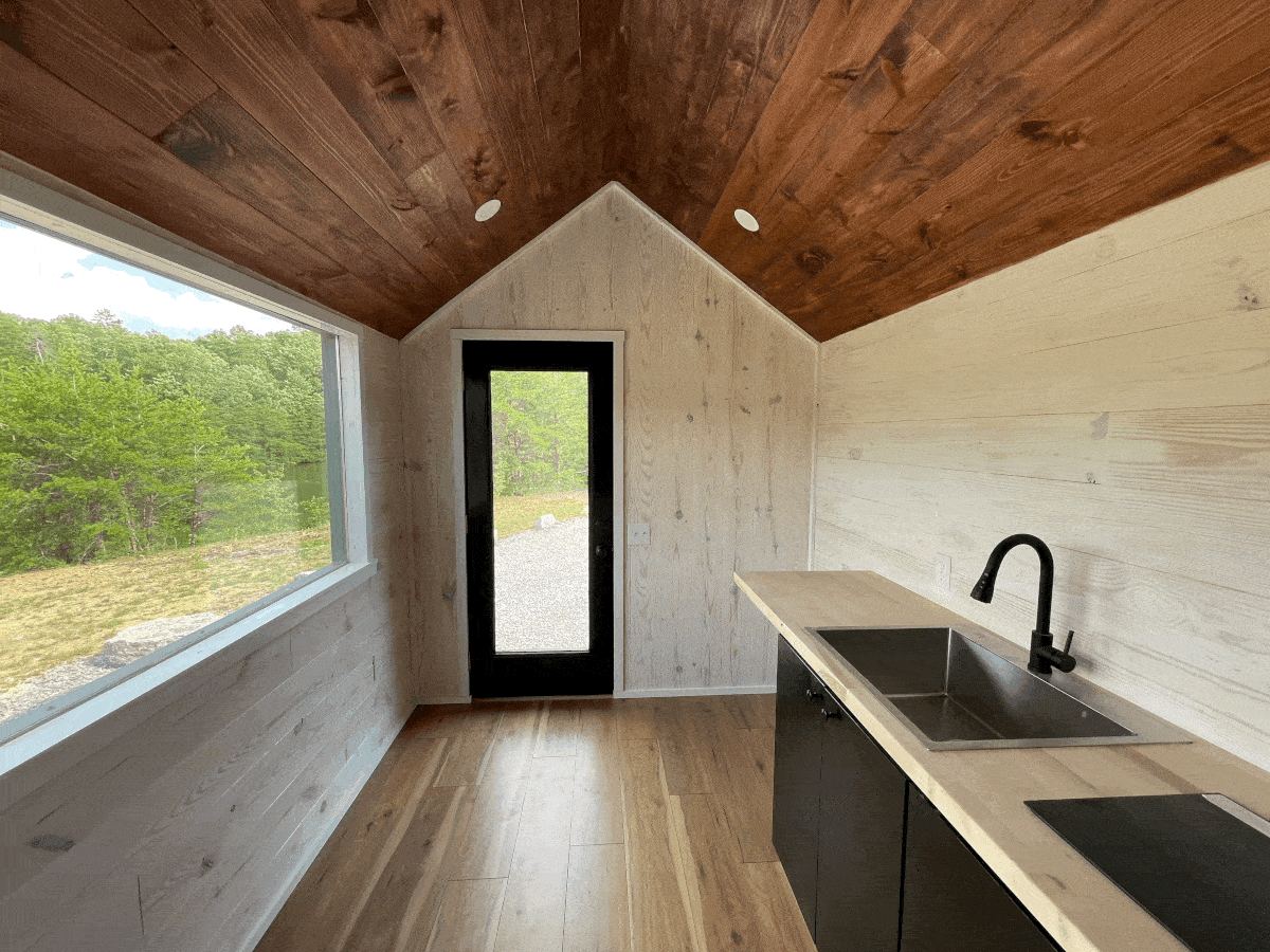 The Nordic abode features a 8' x 22' footprint. This tiny home is built on a trailer but can also be ordered on skids. It comes fully finished out and plug in ready with a full bathroom, basic white vanity, flush toilet and a freestanding tub, small kitchenette with electric stovetop, sink, and outlet for refrigerator this build also boasts tons lots of natural lighting with a large 5x5 picture window and 36”x48” window over the kitchenette.