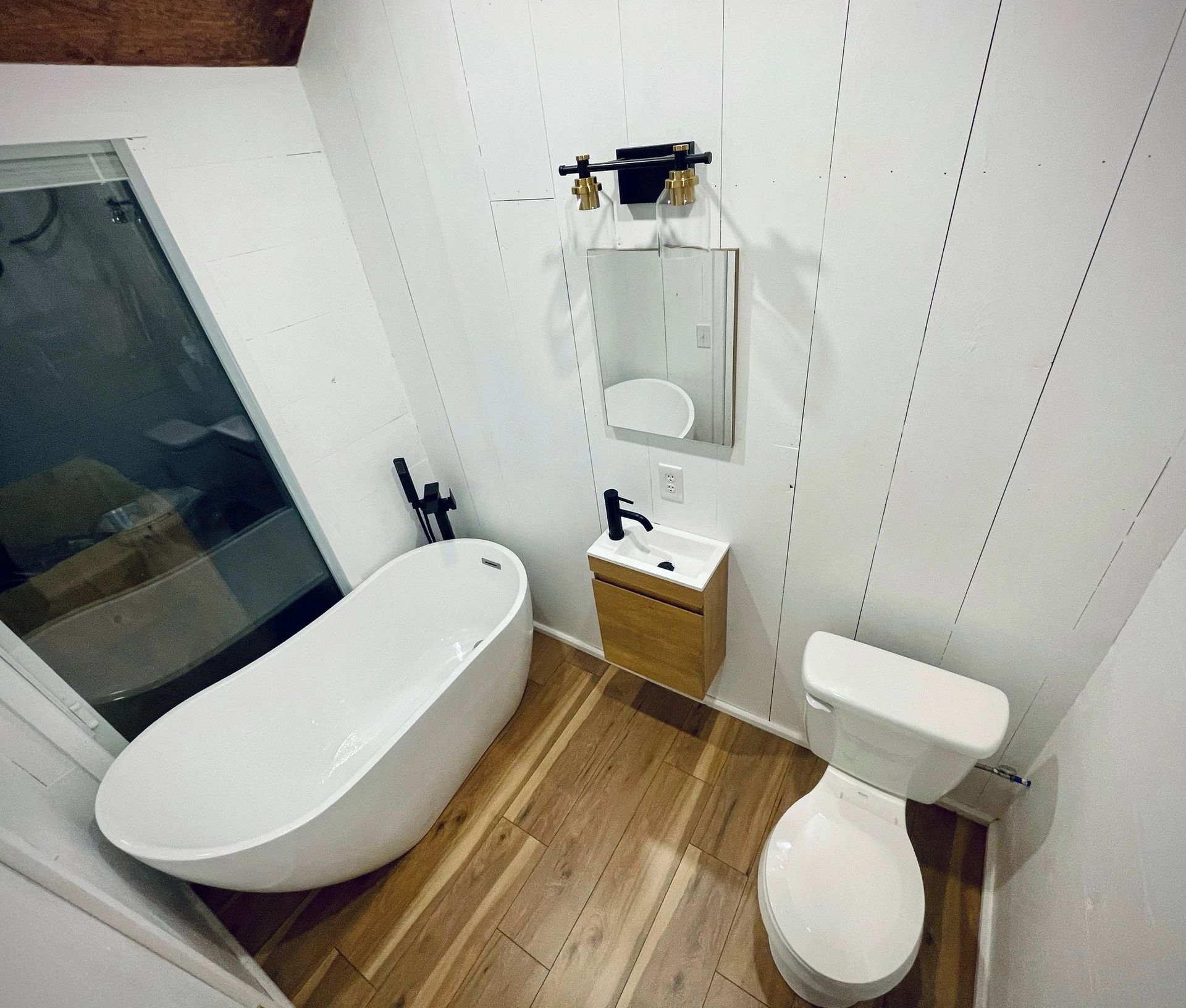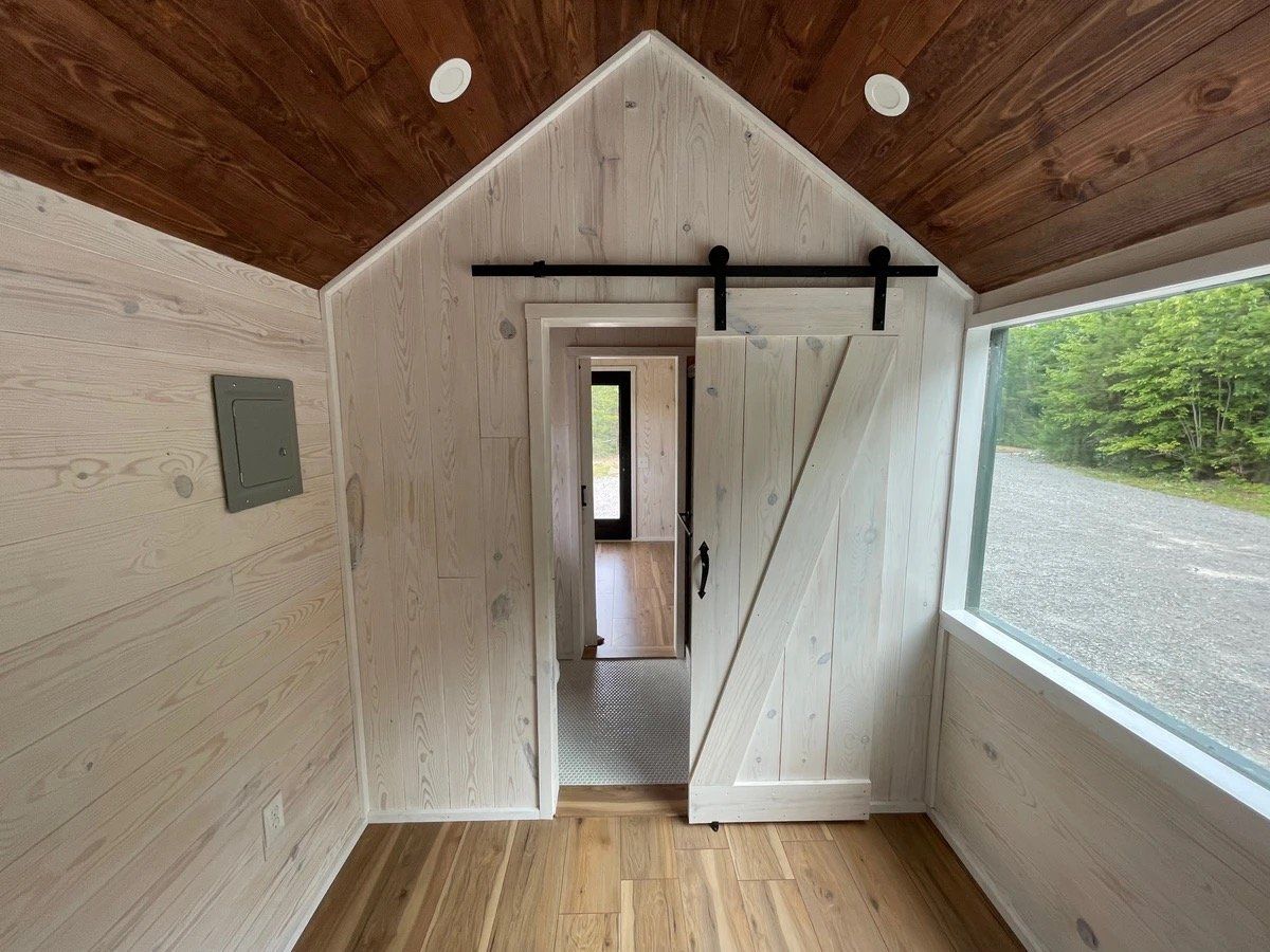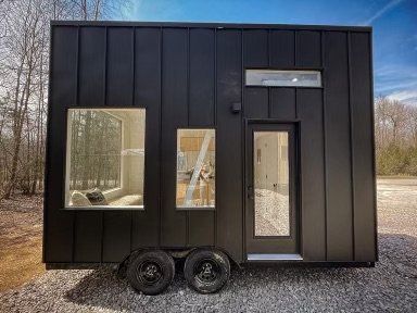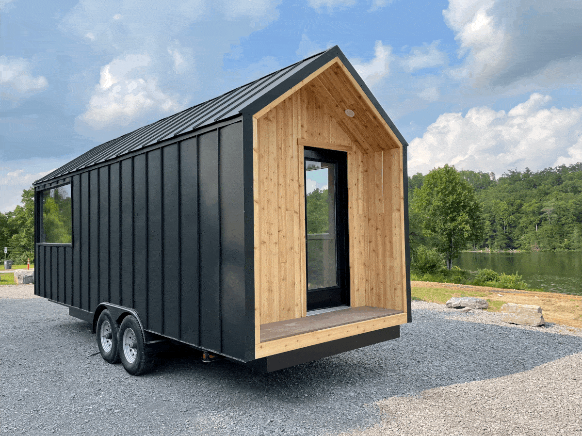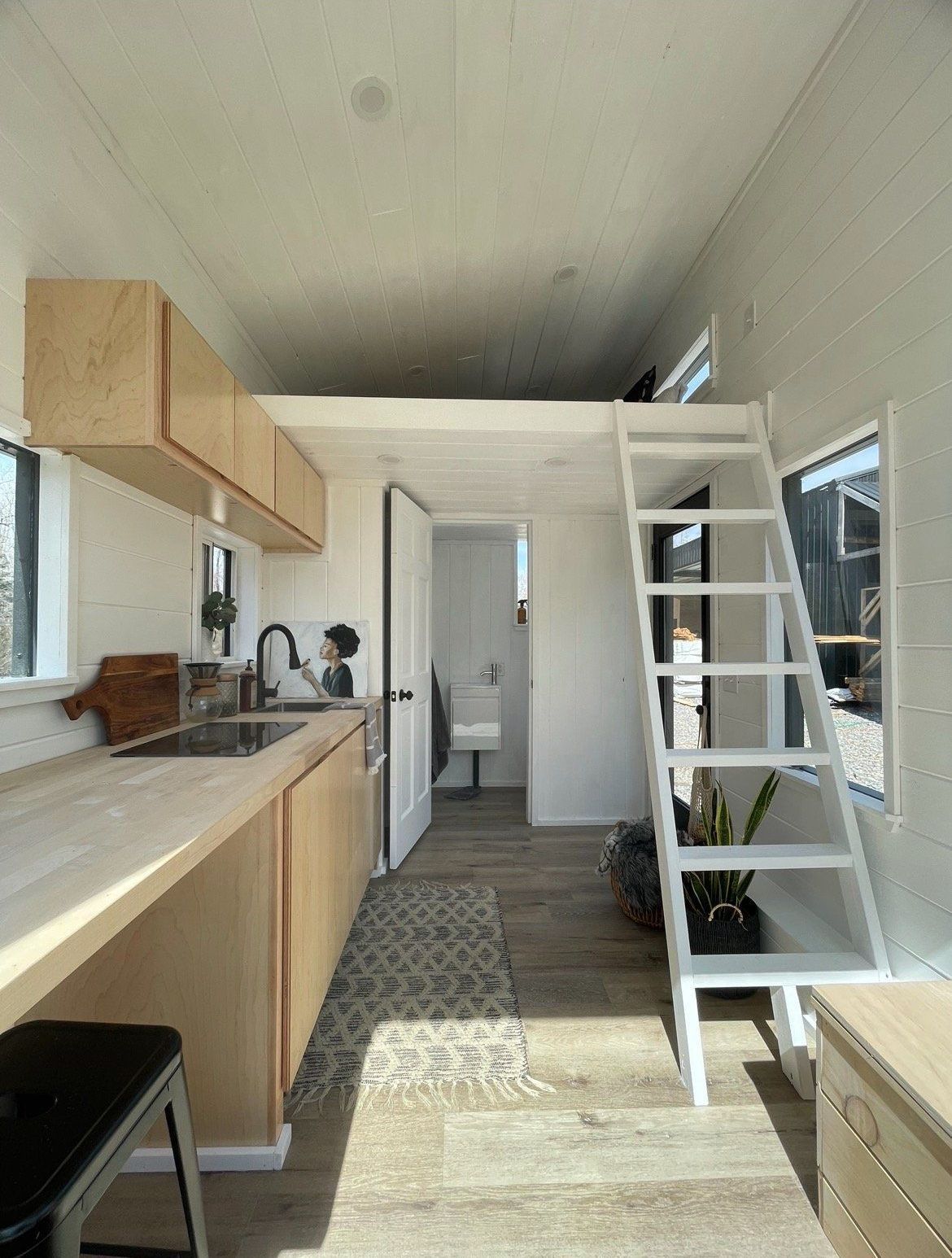 The Nordic abode features a 8' x 22' footprint. This tiny home is built on a trailer but can also be ordered on skids. It comes fully finished out and plug in ready with a full bathroom, basic white vanity, flush toilet and a freestanding tub, small kitchenette with electric stovetop, sink, and outlet for refrigerator this build also boasts tons lots of natural lighting with a large 5x5 picture window and 36”x48” window over the kitchenette.