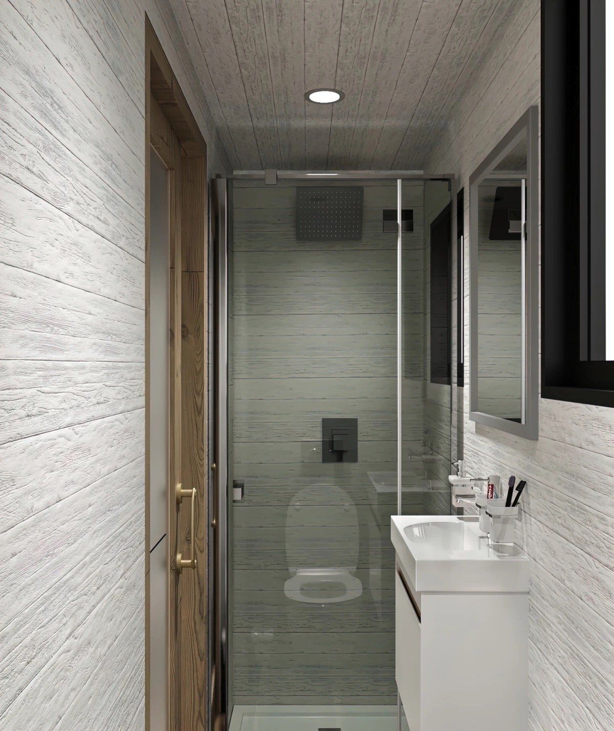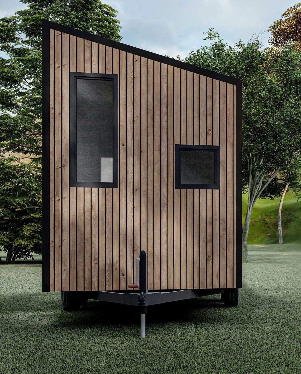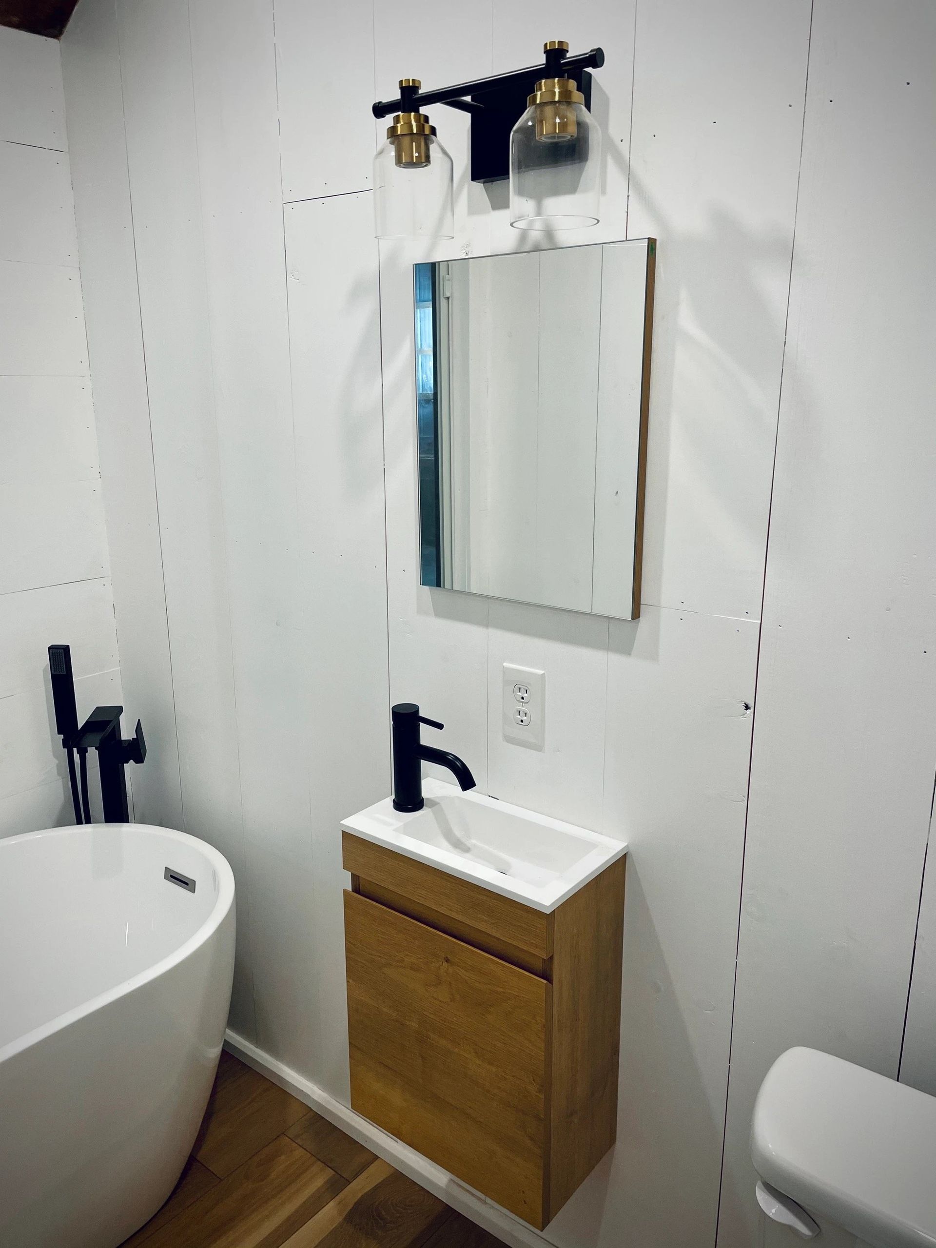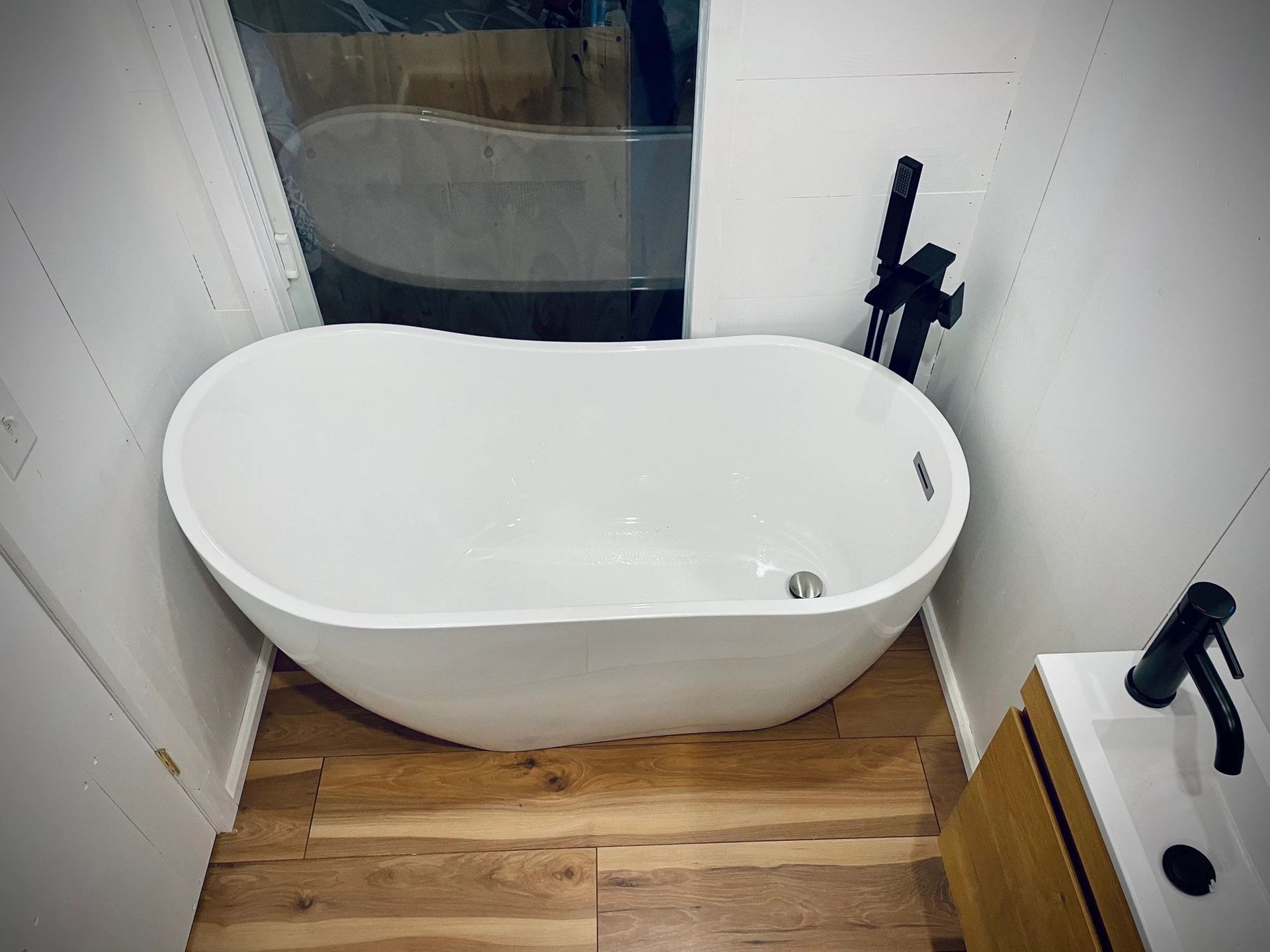 The Nordic abode features a 8' x 22' footprint. This tiny home is built on a trailer but can also be ordered on skids. It comes fully finished out and plug in ready with a full bathroom, basic white vanity, flush toilet and a freestanding tub, small kitchenette with electric stovetop, sink, and outlet for refrigerator this build also boasts tons lots of natural lighting with a large 5x5 picture window and 36”x48” window over the kitchenette.