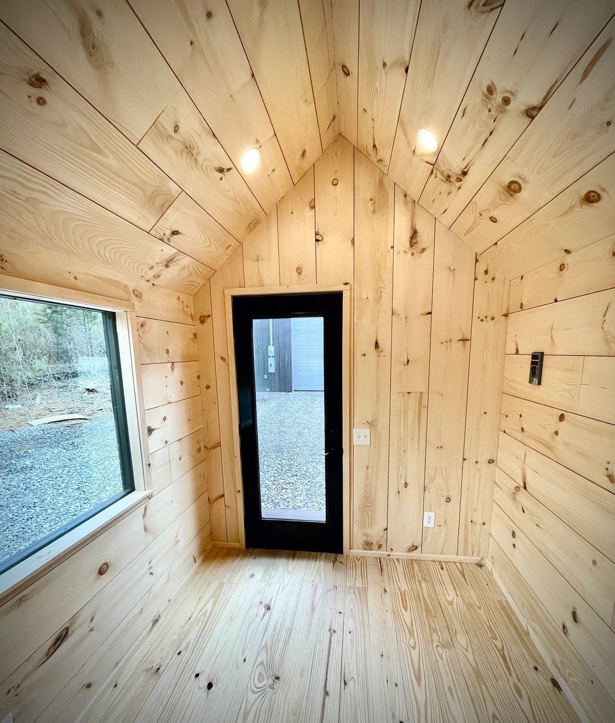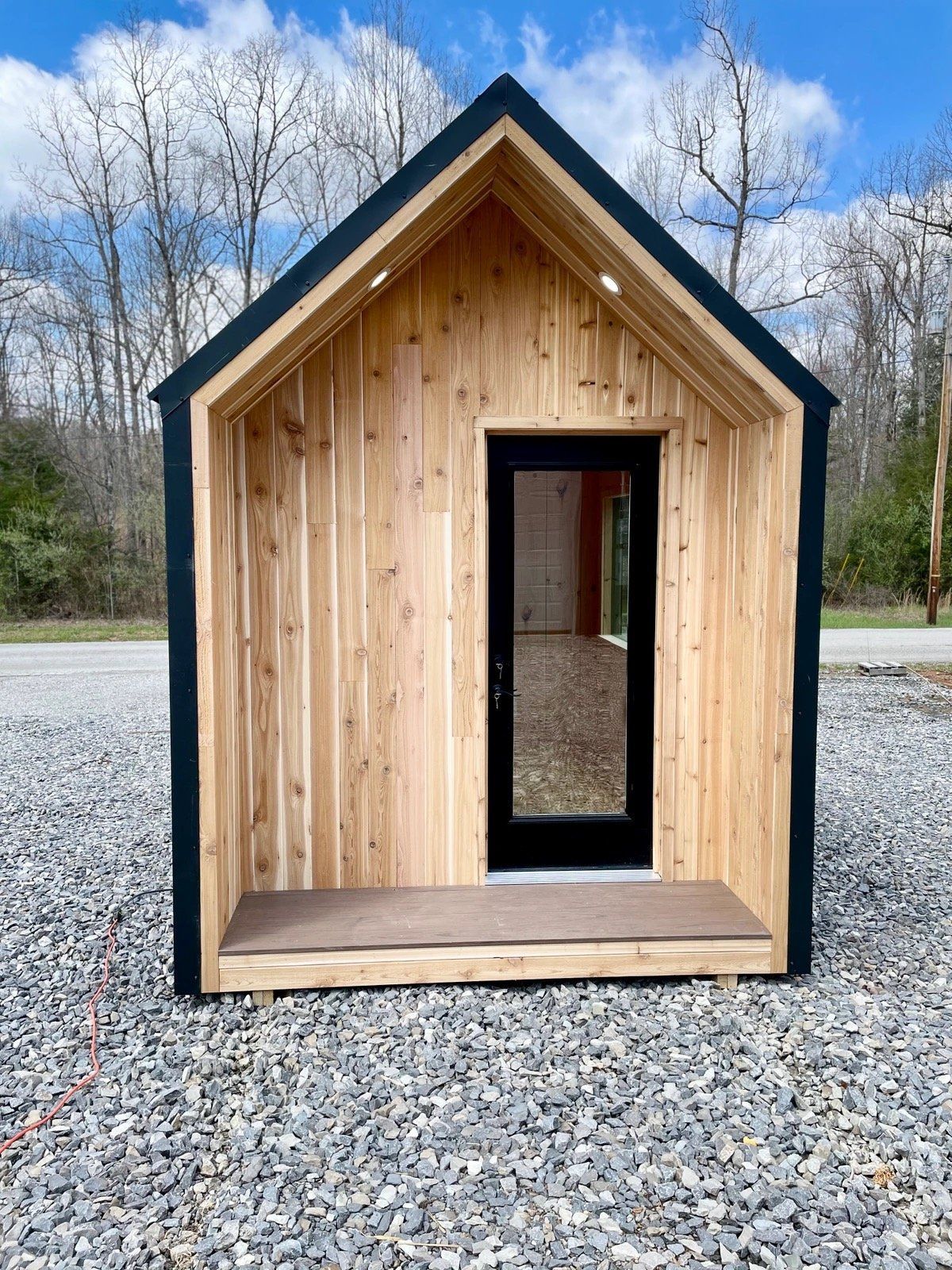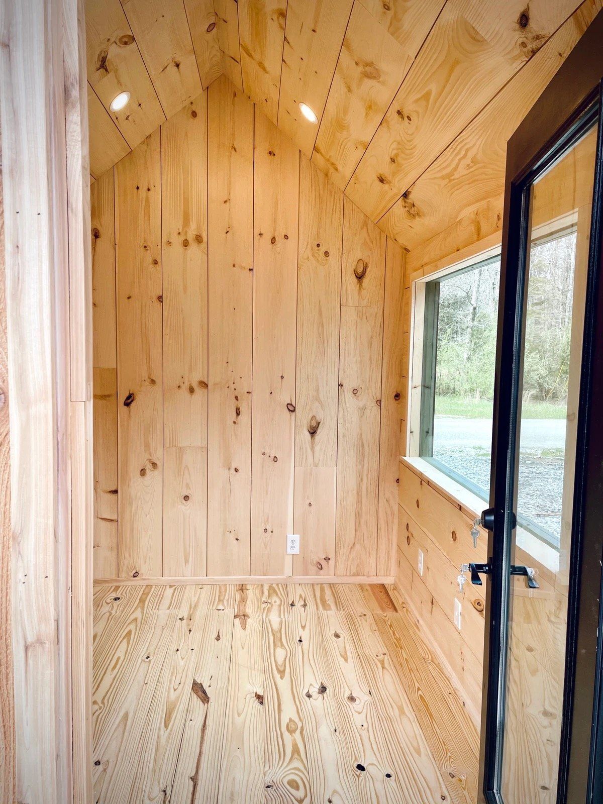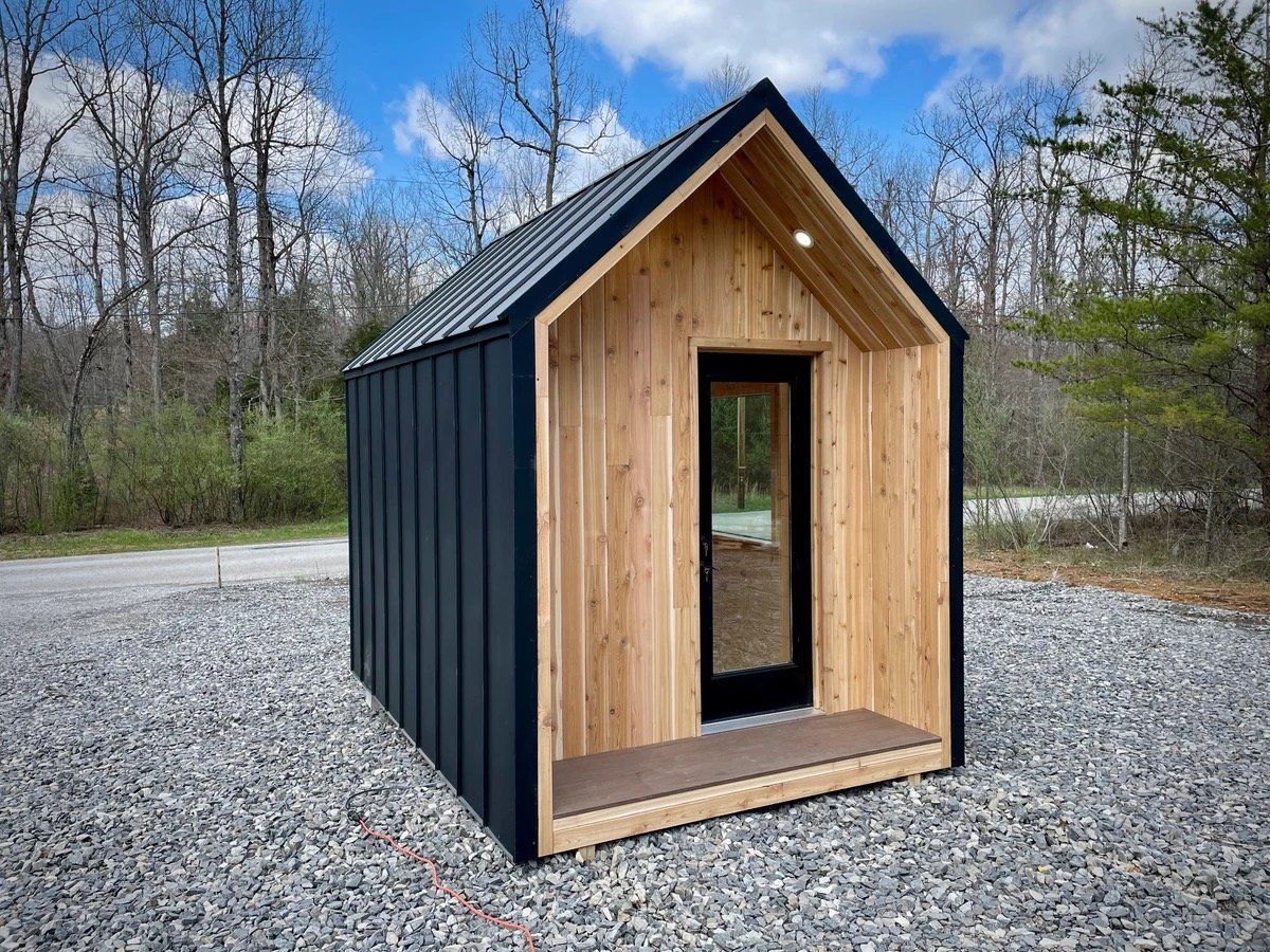 The standard Studio features a gorgeous Pine interior, a large 5’x3’ picture window, black standing seam metal on side walls and roof, cedar tongue and groove on front and back wall as well as a 2ft recessed porch