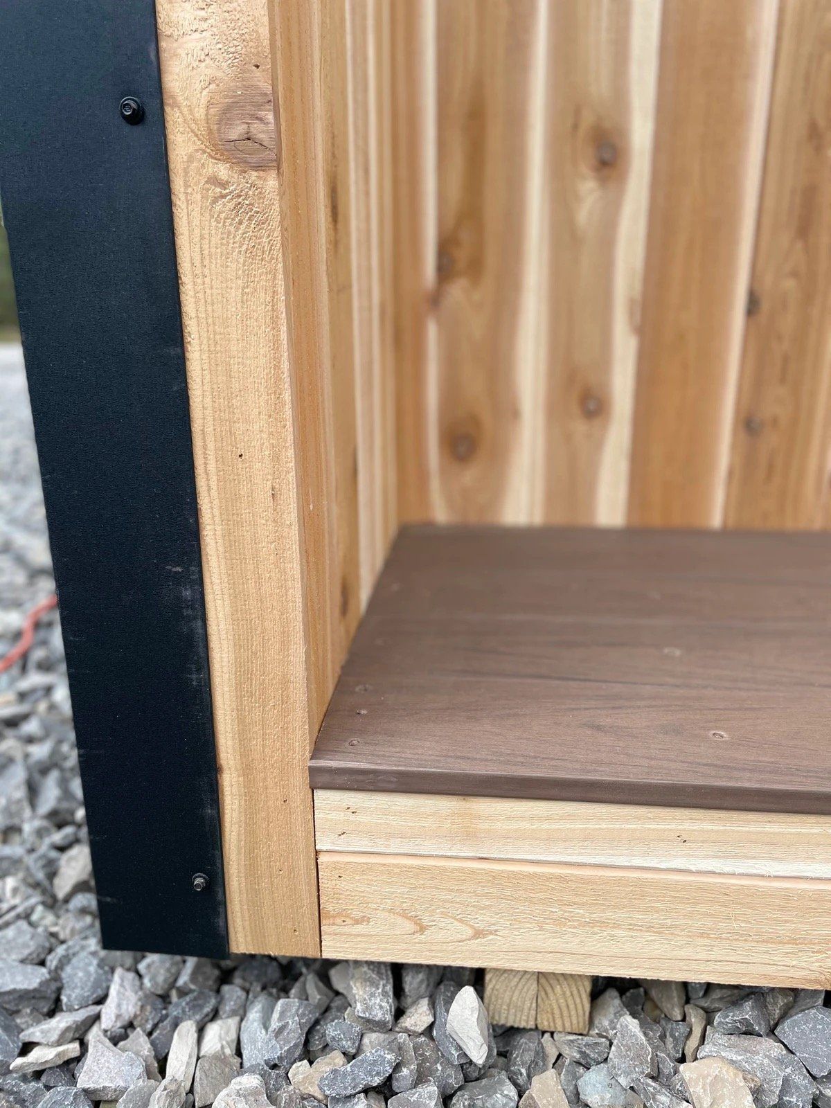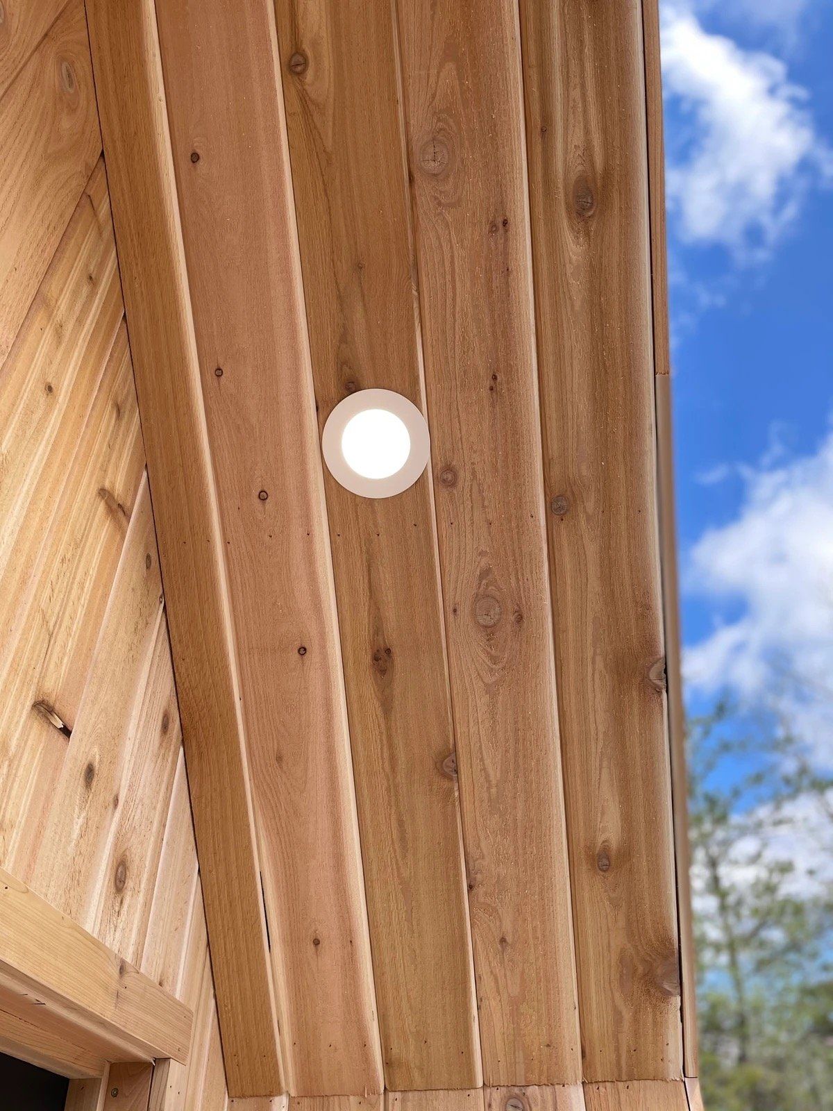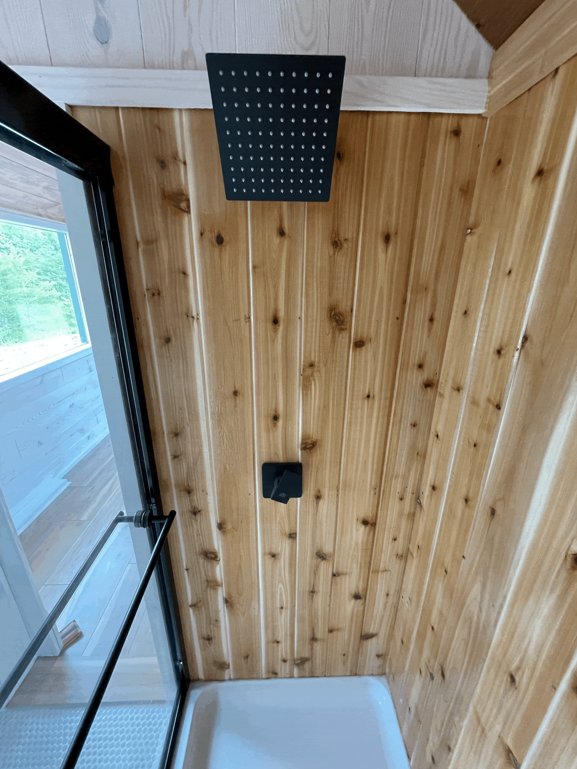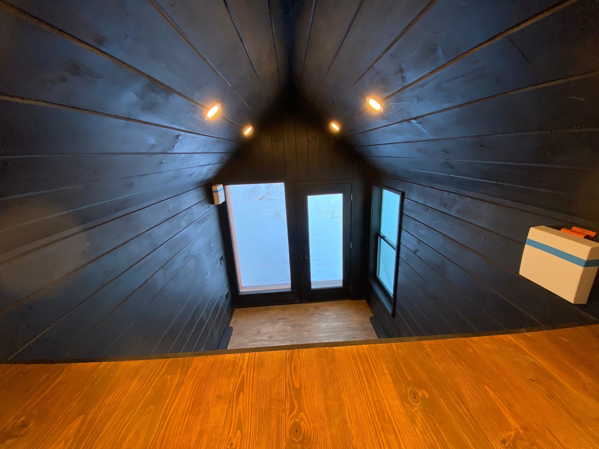 The standard Studio features a gorgeous Pine interior, a large 5’x3’ picture window, black standing seam metal on side walls and roof, cedar tongue and groove on front and back wall as well as a 2ft recessed porch