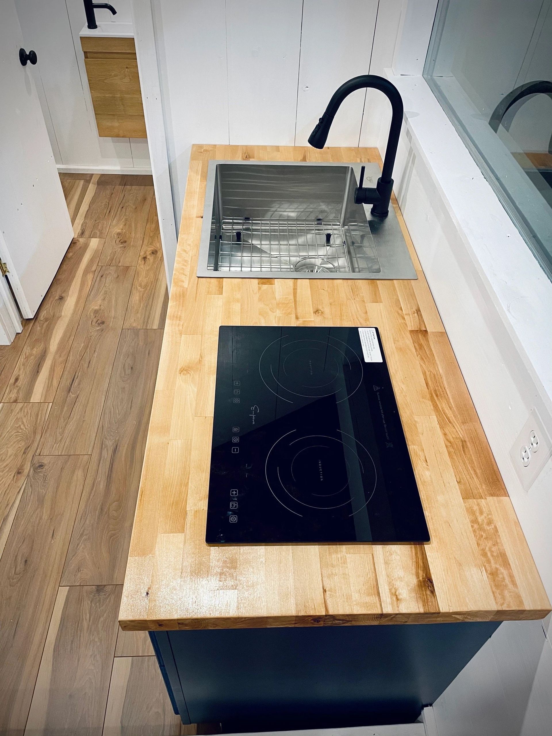 Kitchenette is complete with lower cabinets, electric stovetop, sink, and butcher block countertop with desk area.