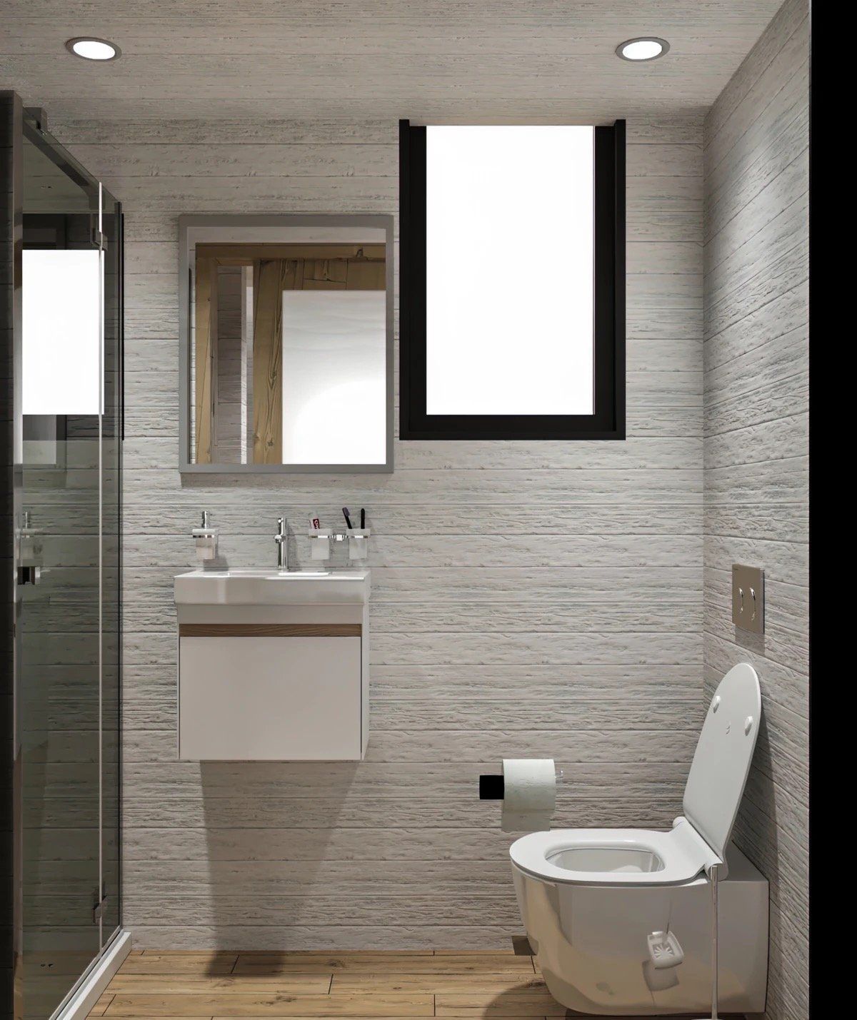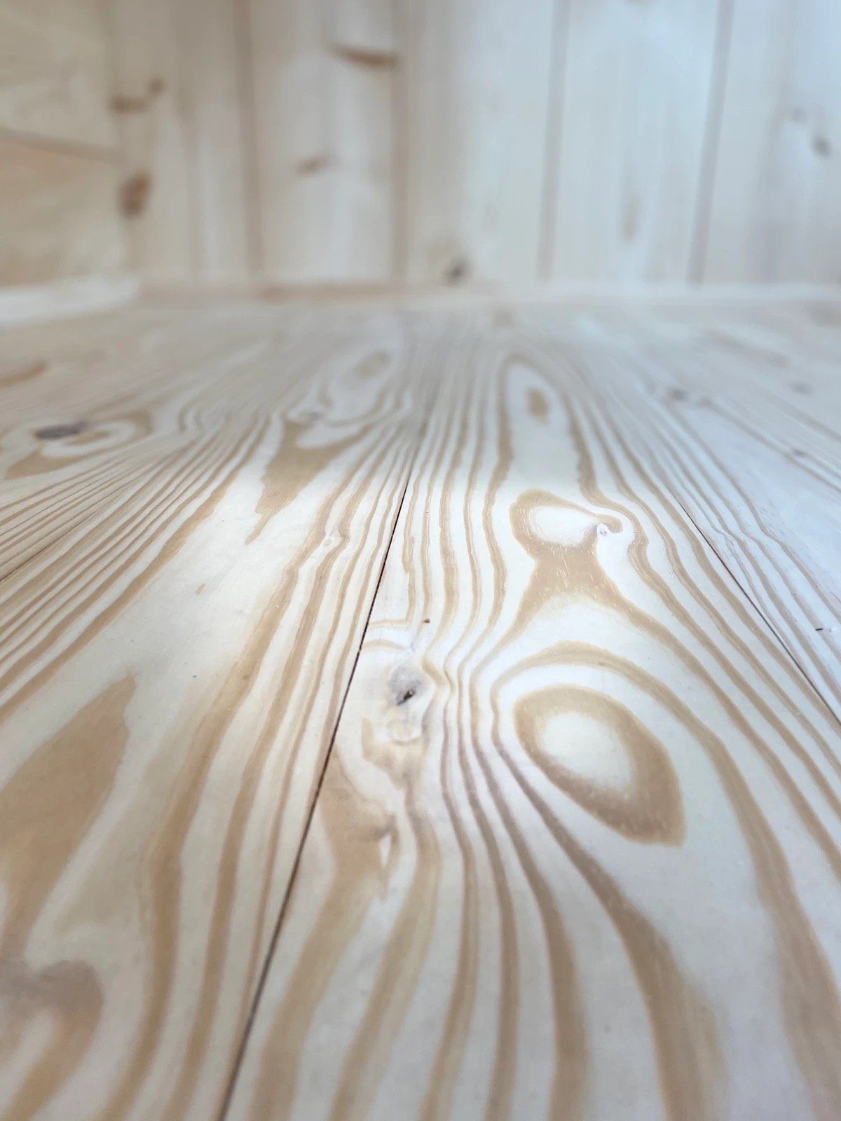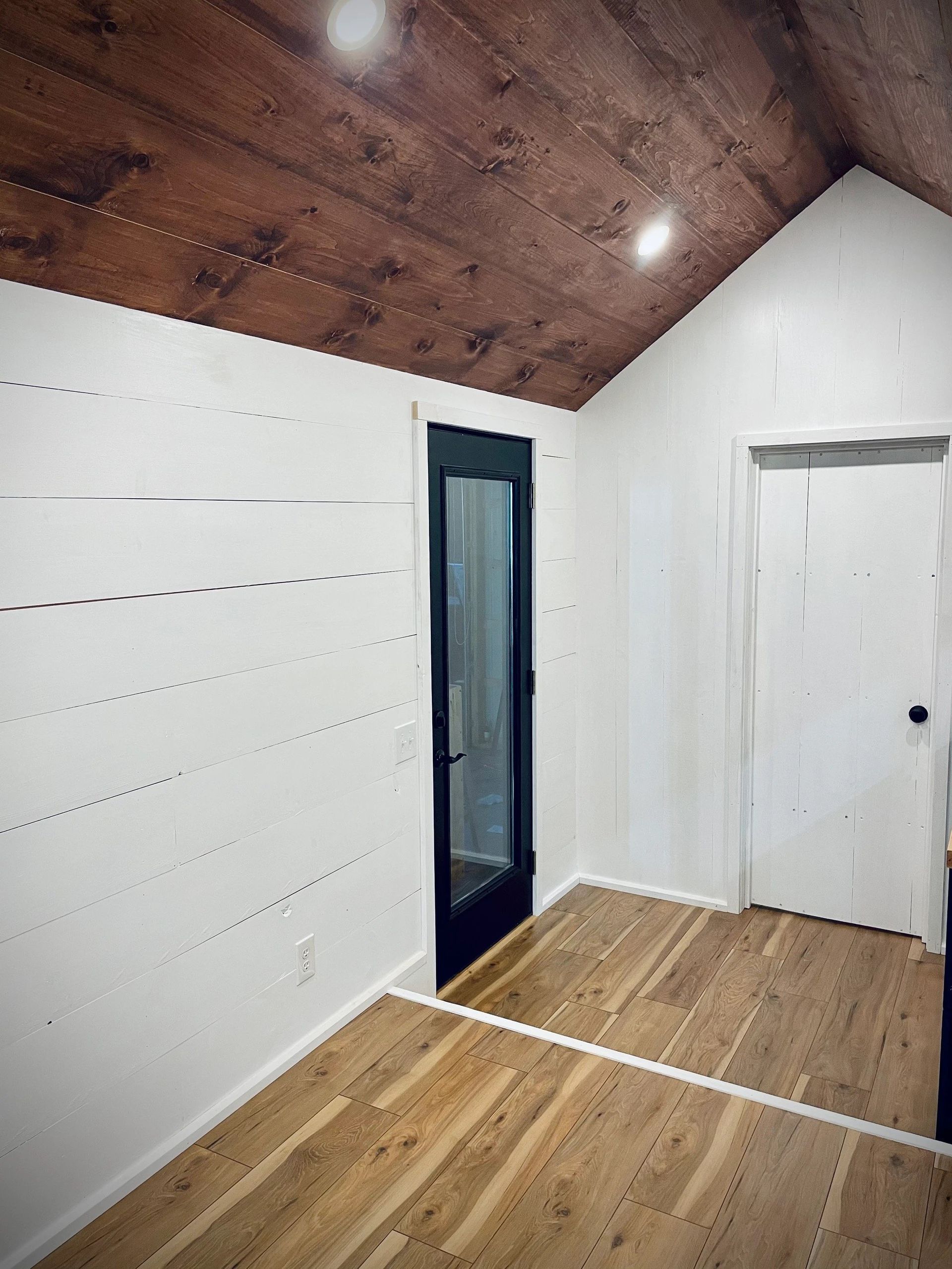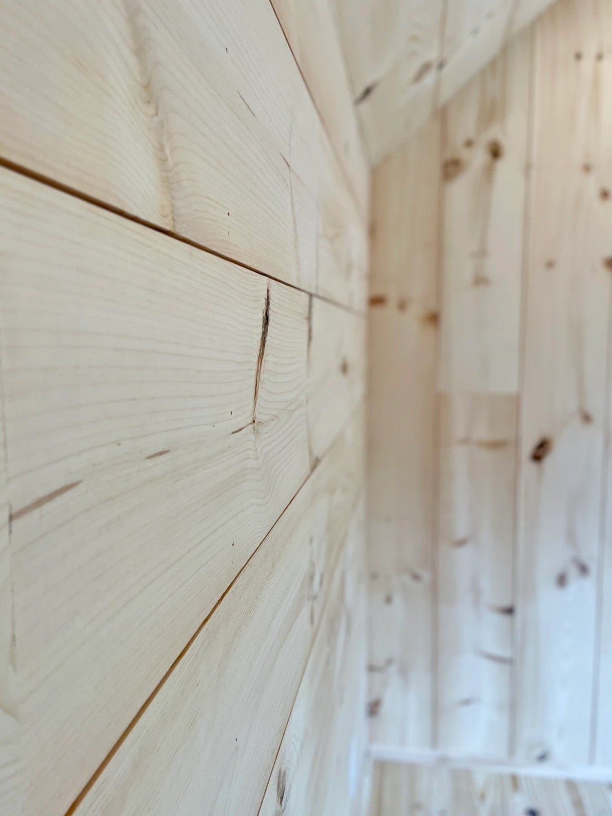 White pine paneling for the interior walls, and waterproof vinyl flooring.