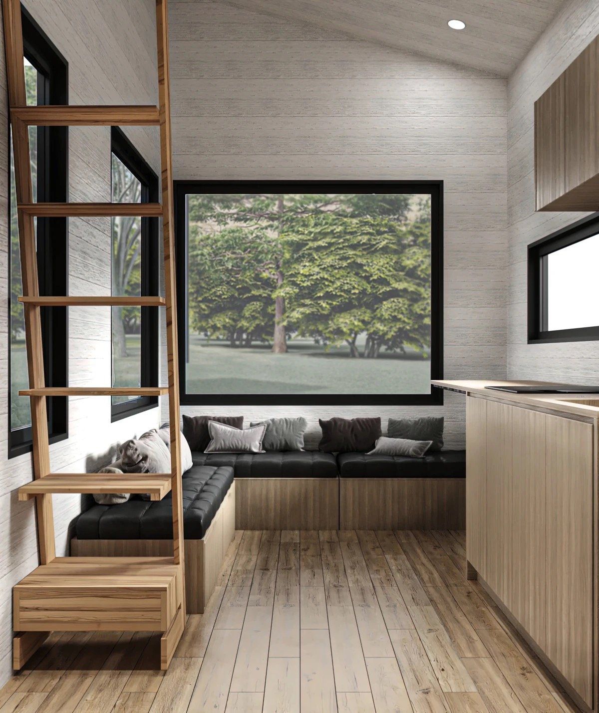 The minimalist is designed to offer everything you need for a small living apartment. This 8x16 space includes a full bathroom, kitchen, washer/ dryer, and loft area. It comes with six picture windows and two opening windows.