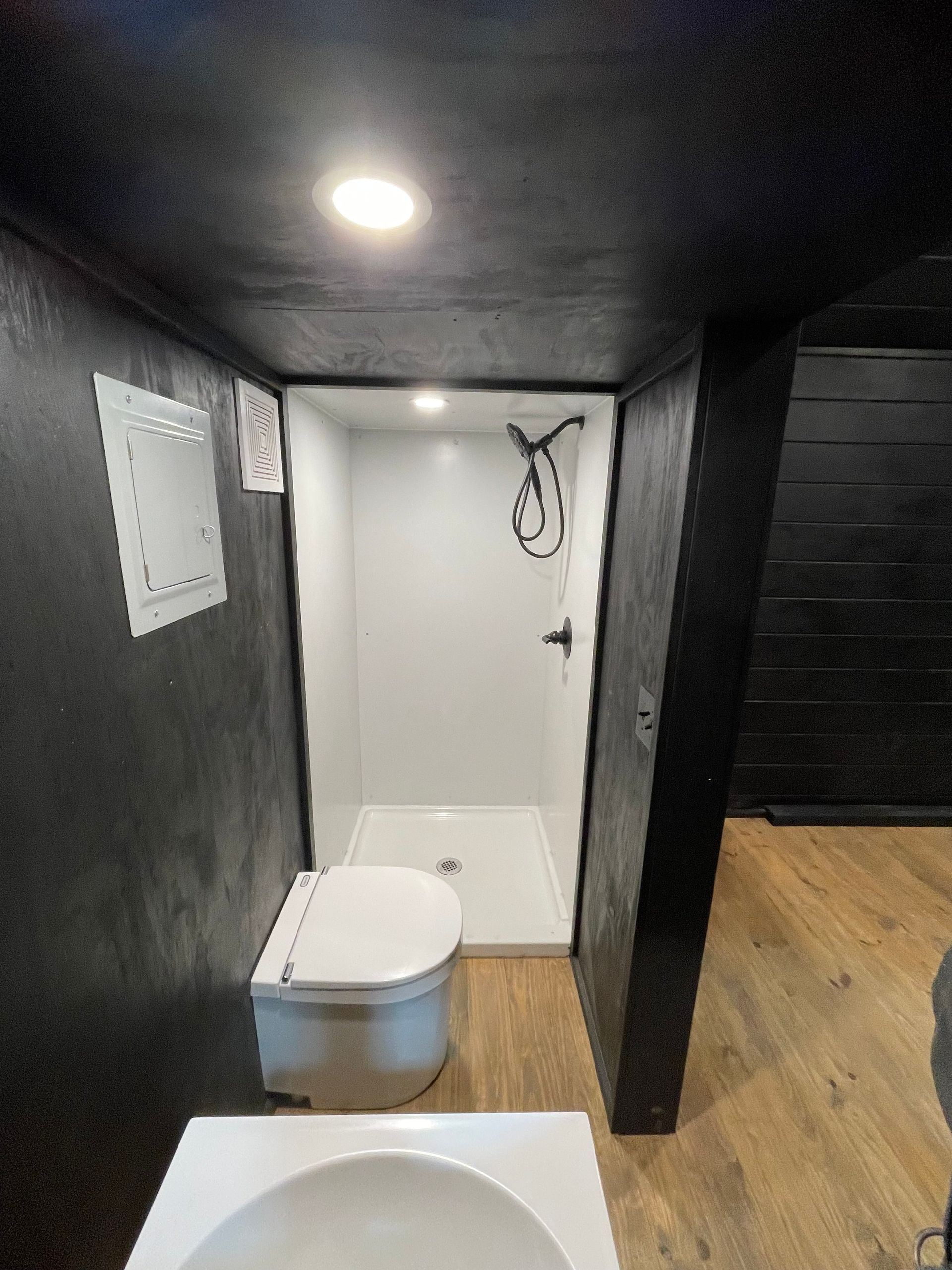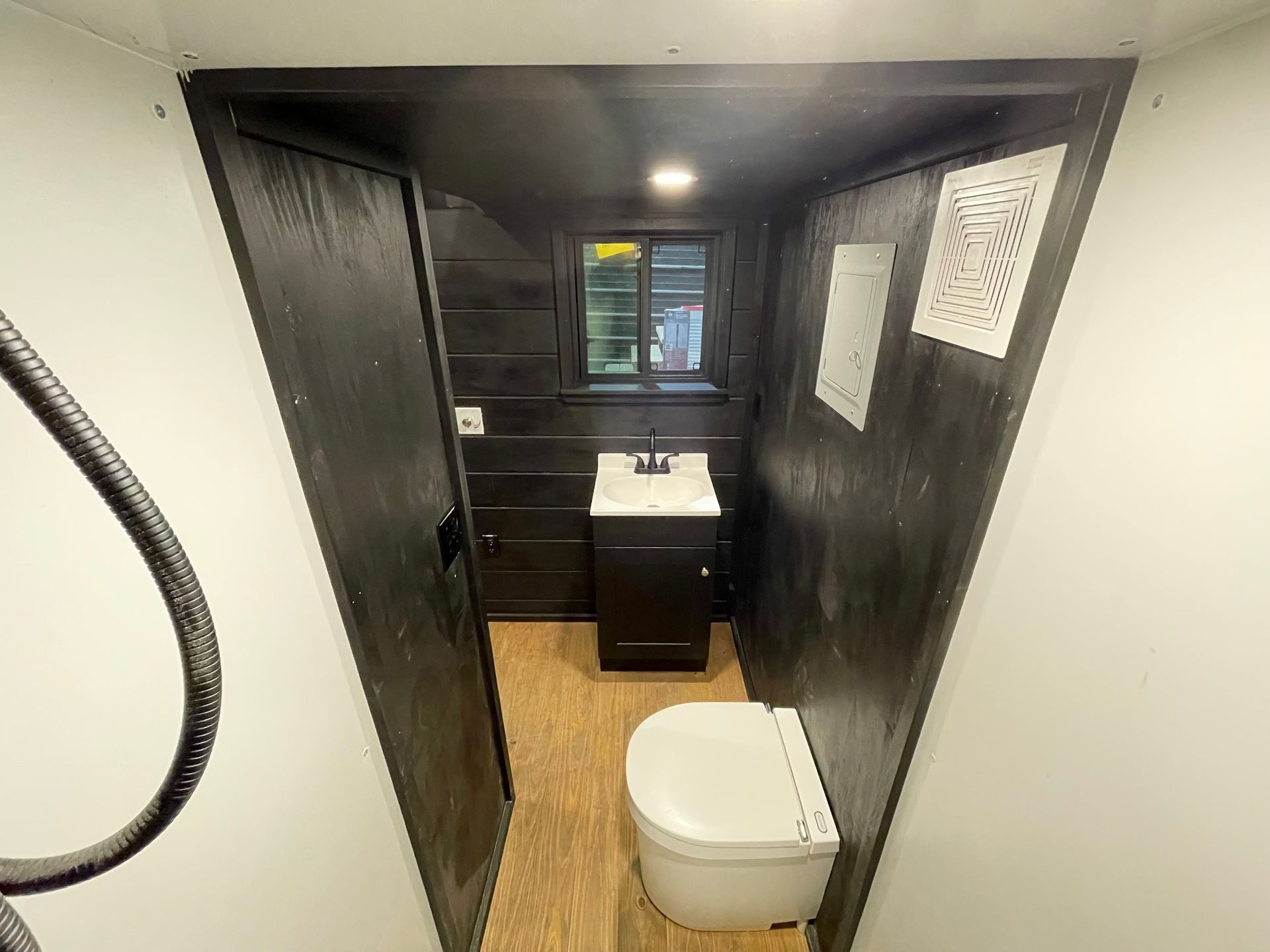 The base model is built on wheels and features a full bathroom with flush toilet, small vanity and shower, loft above bathroom and lots of natural light with two 3’x5’ windows.